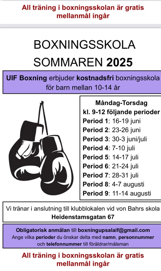 Hjärtligt välkomna att anmäla till sommarens boxningsskola enligt informationen på flyern nedan. Under samma tid erbjuder vi också boxningsträning på Studenternas på Uppsala Summer Zone. Dit behövs ingen föranmälan och det är öppet för alla åldrar.